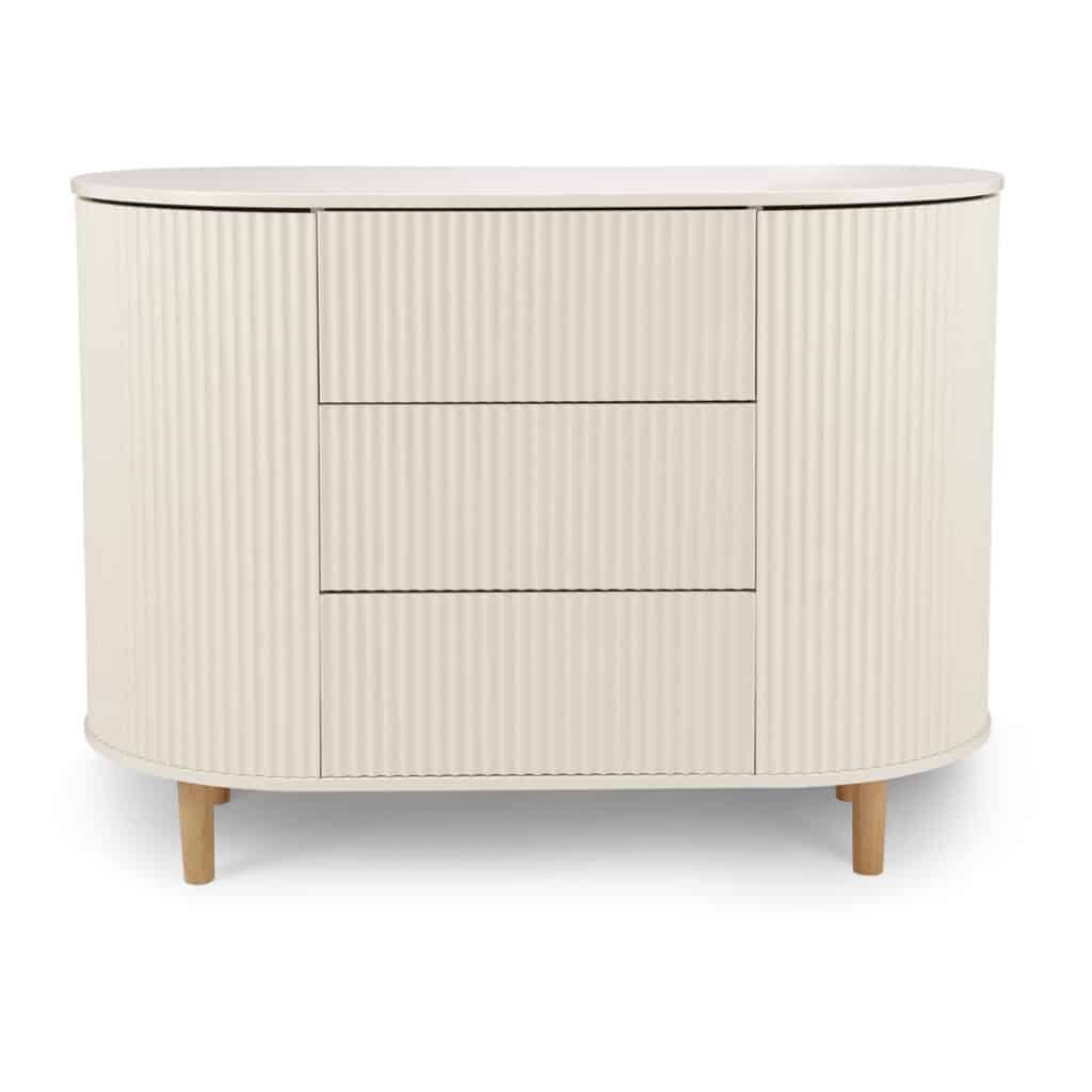 Dette elegante klædeskab kombinerer et ovalt udtryk med gennemtænkt funktionalitet, der gør det til en opbevaringsløsning, der kan bruges i generationer. Perfekt til børneværelset eller soveværelset, hvor det både skaber orden og elegance.