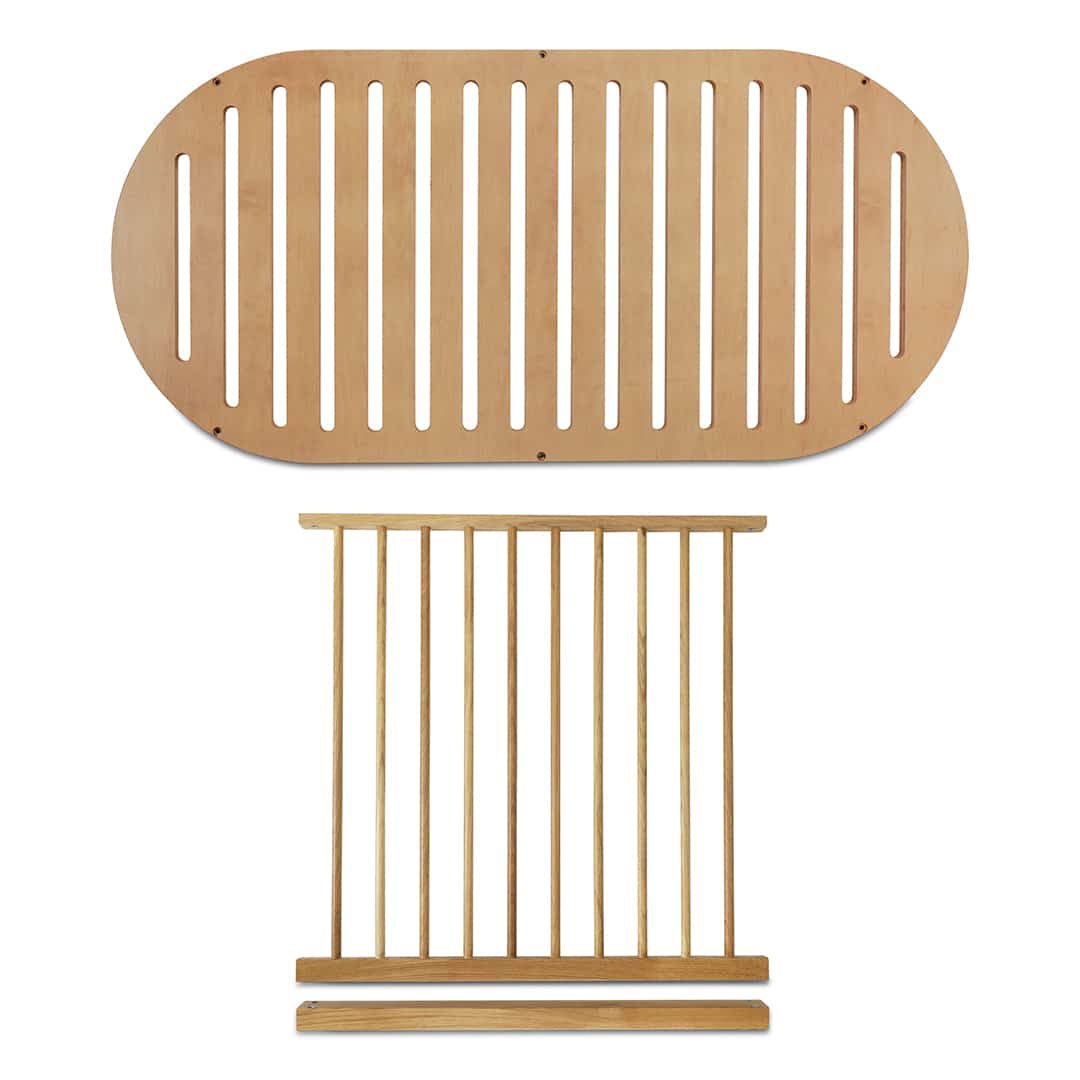 Når barnet vokser ud af tremmesengen kan du hurtigt og nemt fjerne tremmesiden, sengebunden og senge kanten, og tilføje forlængersættet, så sengen bliver 150 cm lang og følger barnet i flere år.
