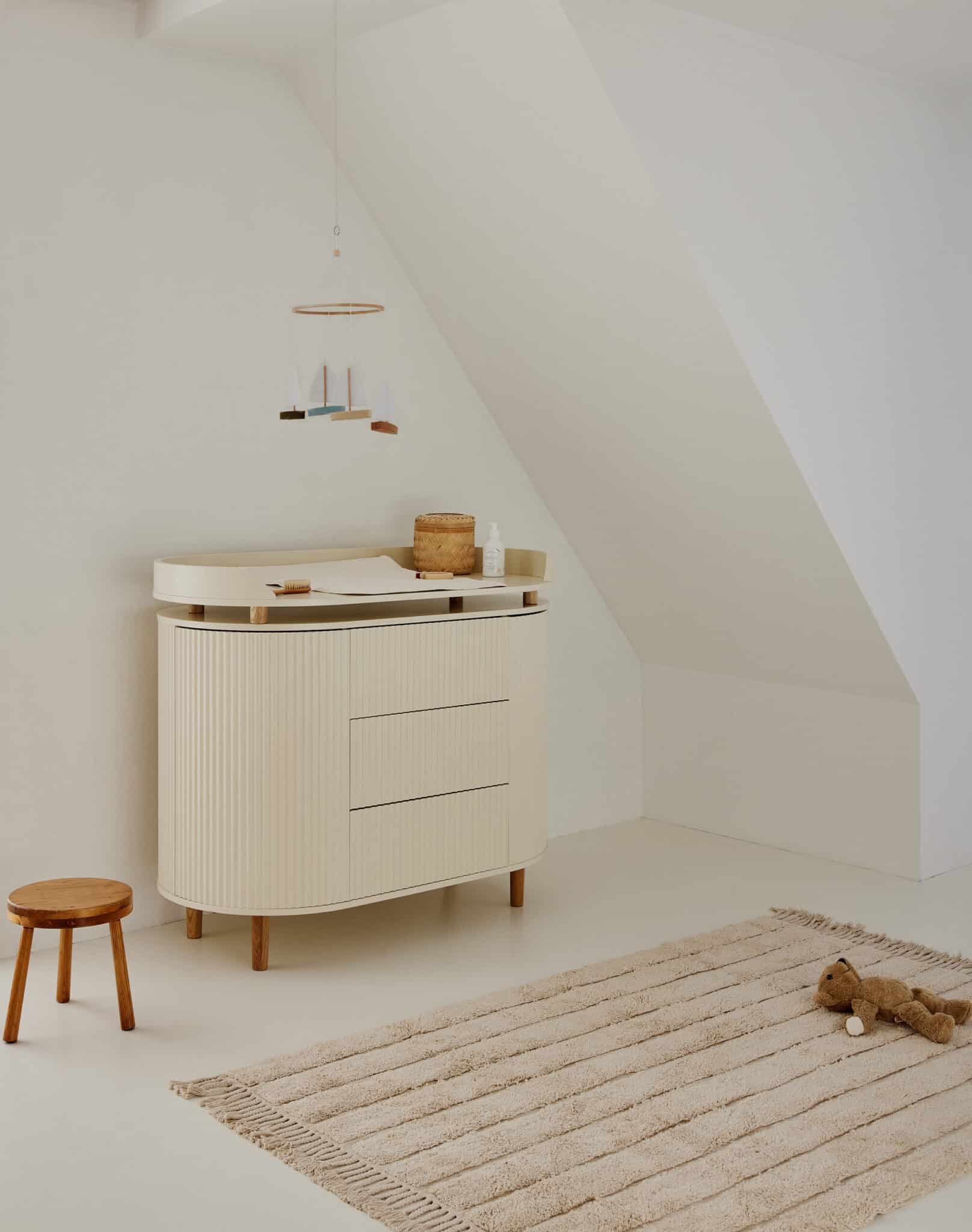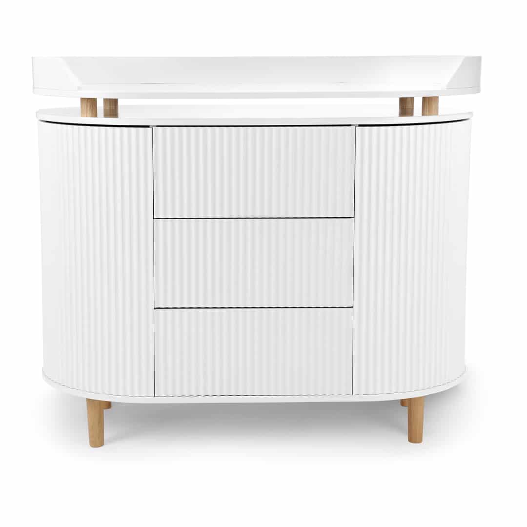 Med et elegant udtryk og gennemtænkt funktionalitet kan kommoden hurtigt og nemt forvandles til en smuk pusleplads med en puslepladen som kan tilkøbes og monteres uden synlige huller i bordpladen.