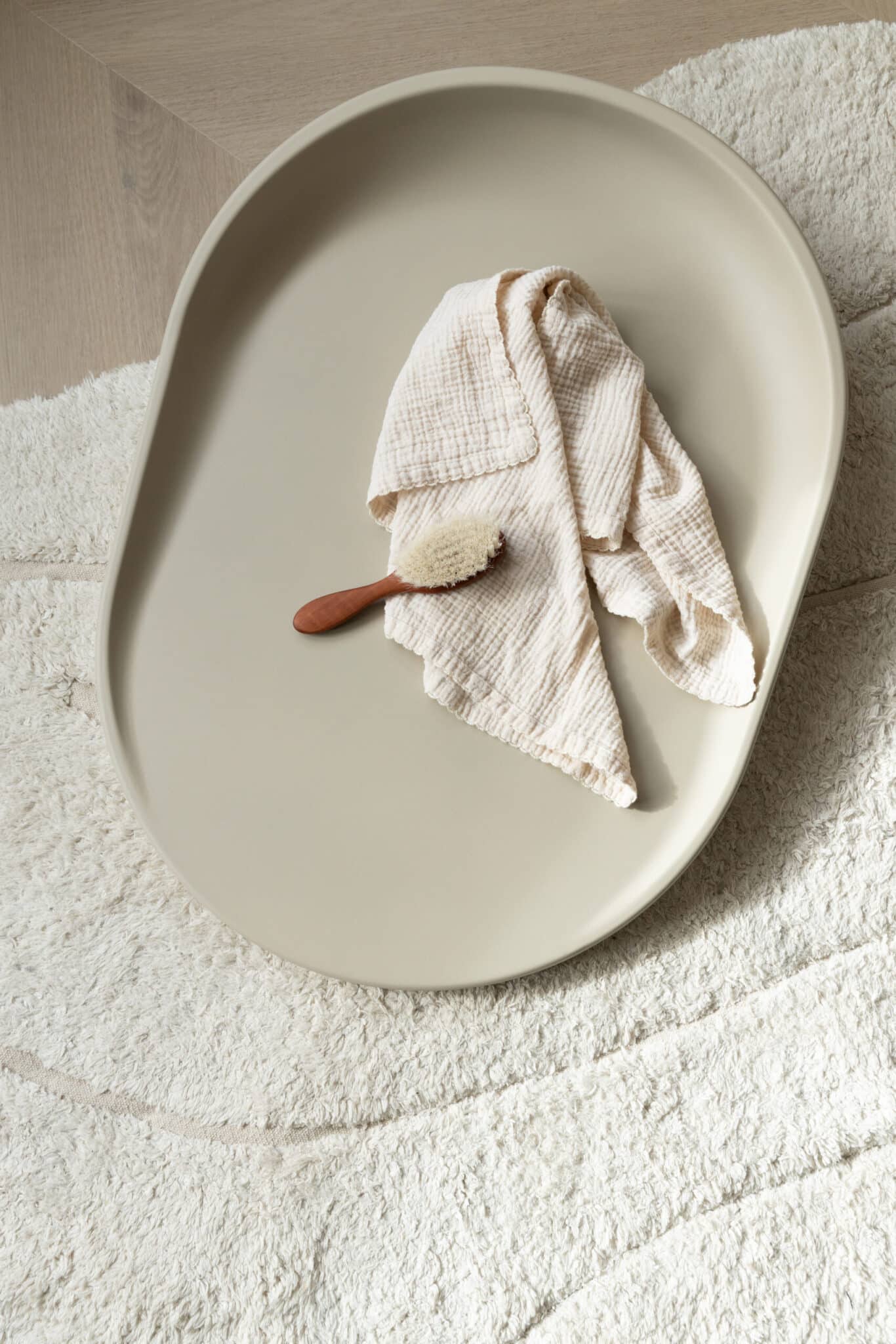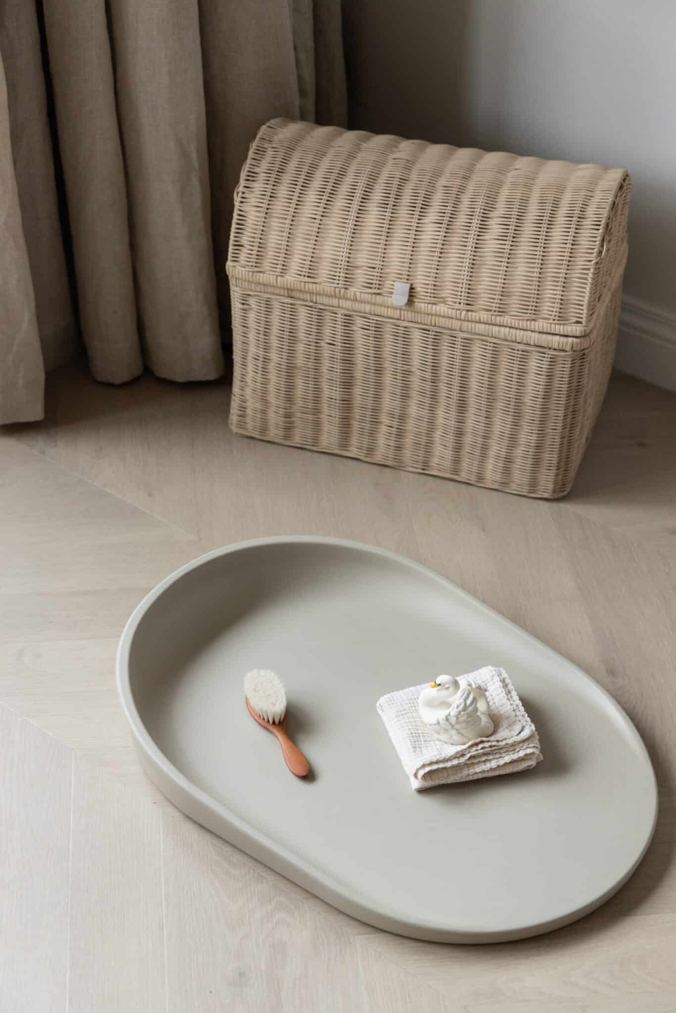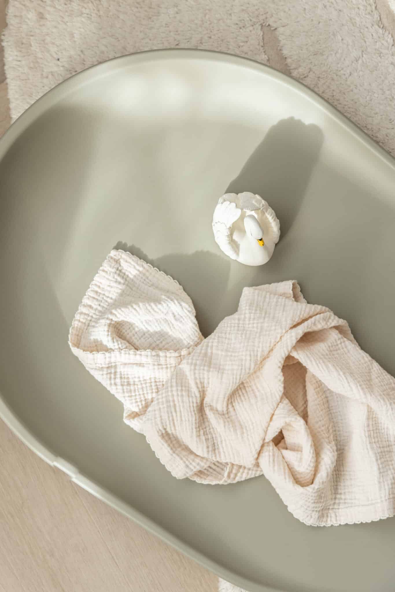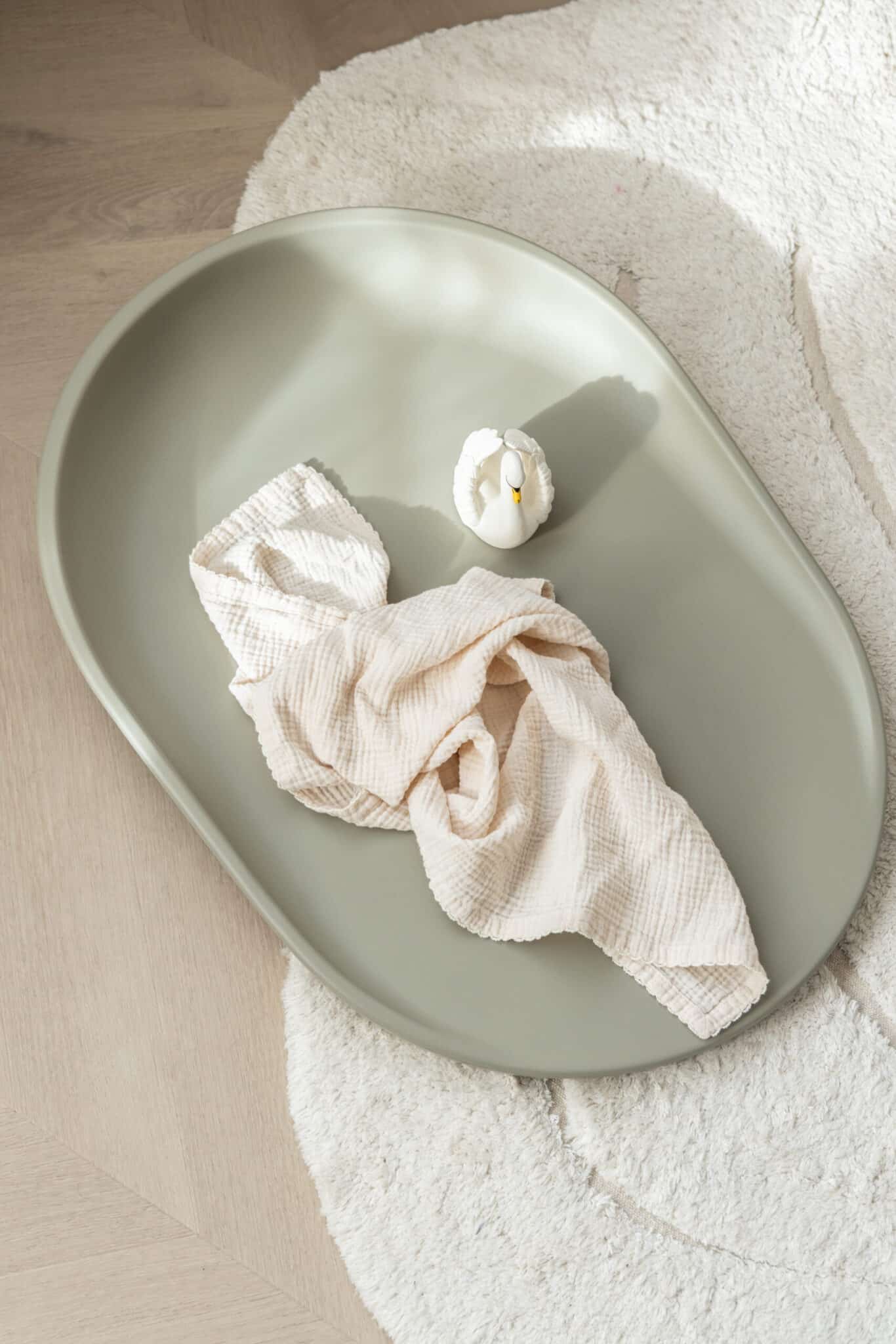 Puslepuden Dusty Olive er designet i et ovalt og smukt design, med bløde former, der passer perfekt til vores KAI møbler, hvor både komfort og sikkerhed er fokus.