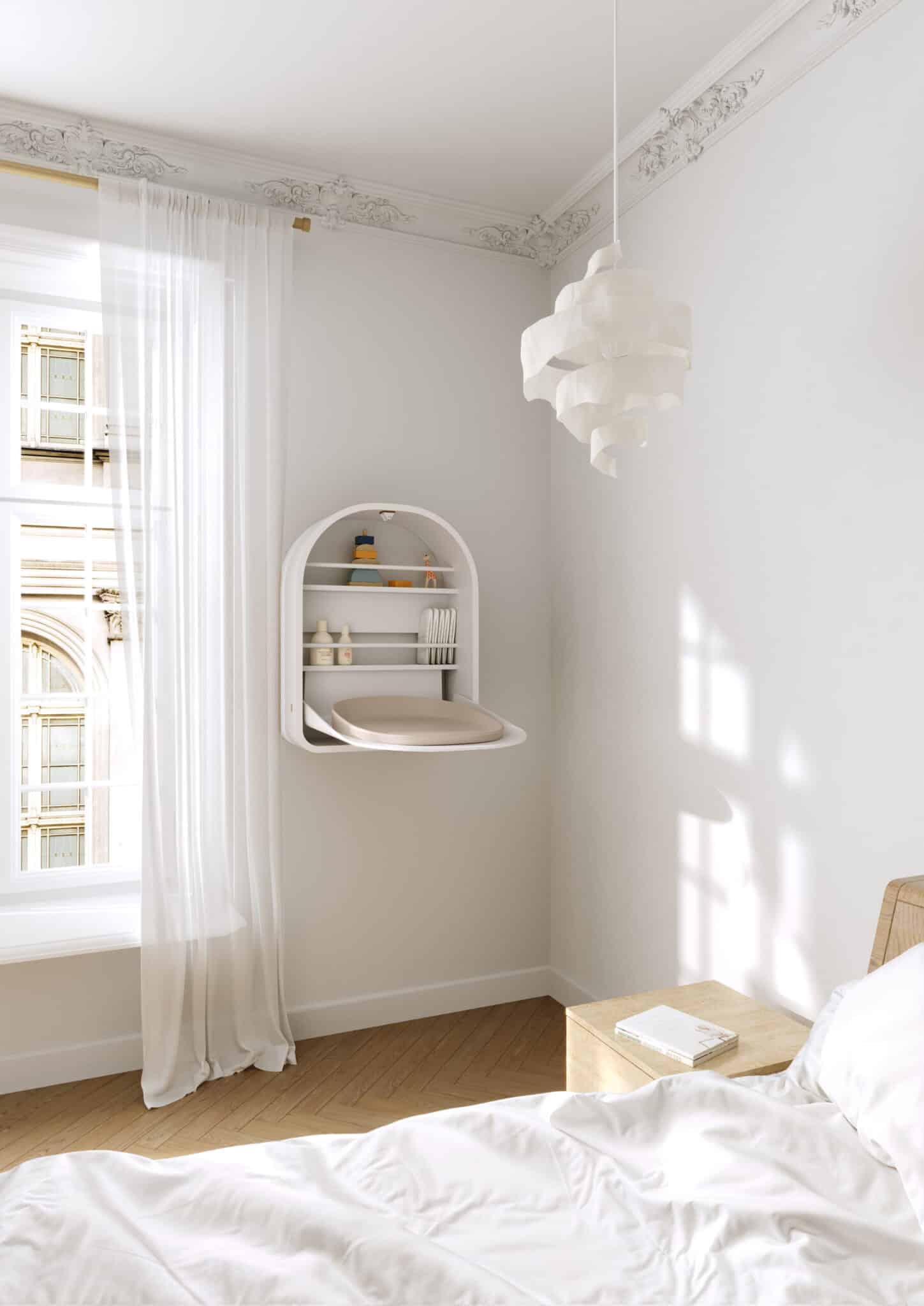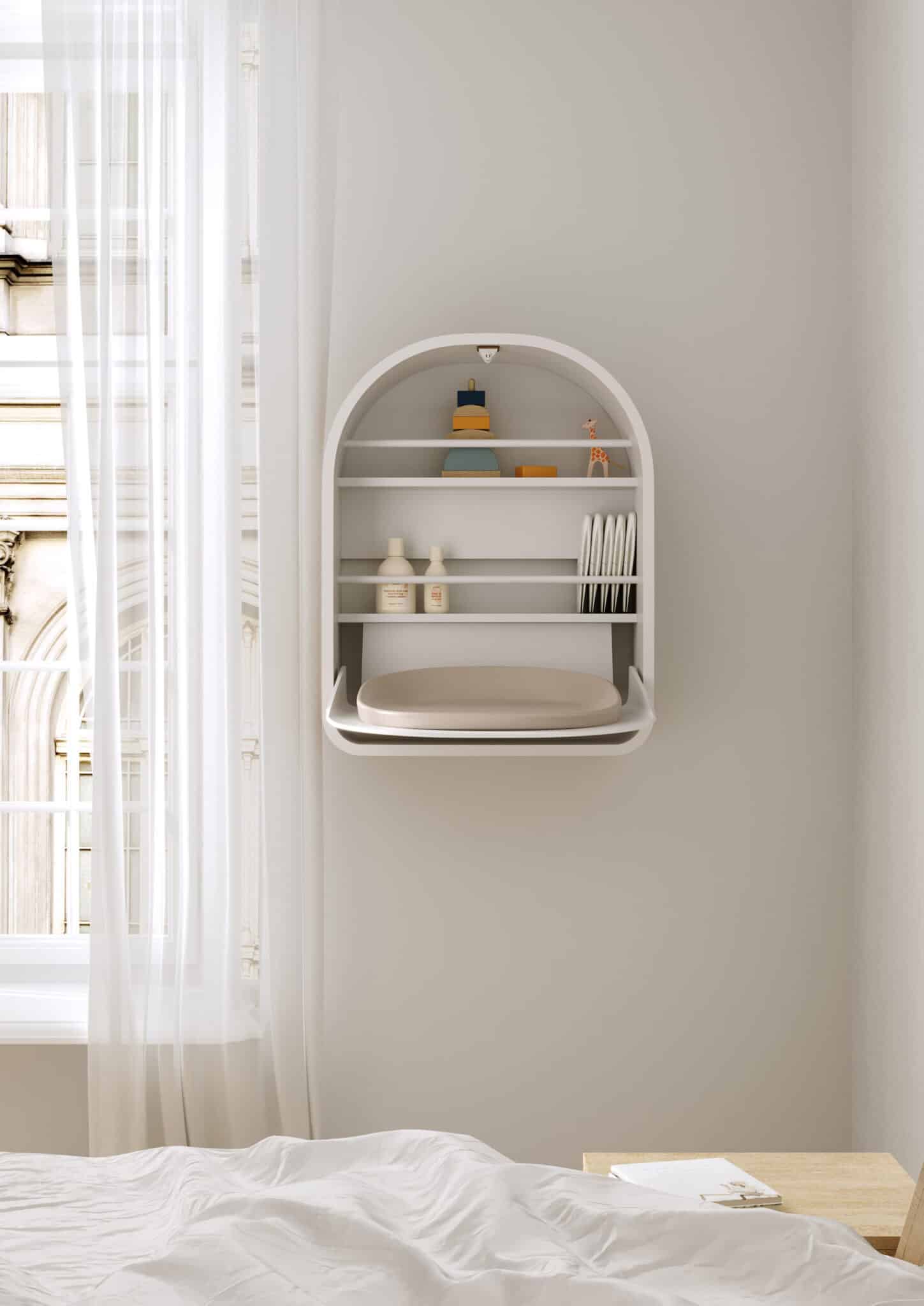 Kai væghængt puslebord kombinerer æstetik og funktionalitet med sine runde, smukke former. Det er perfekt til mindre boliger og pladsbesparende værelser, hvor det både sparer plads og tilføjer et stilfuldt touch. Puslebordet åbnes og lukkes nemt med det Easy Touch-system, hvilket gør det både praktisk og brugervenligt.