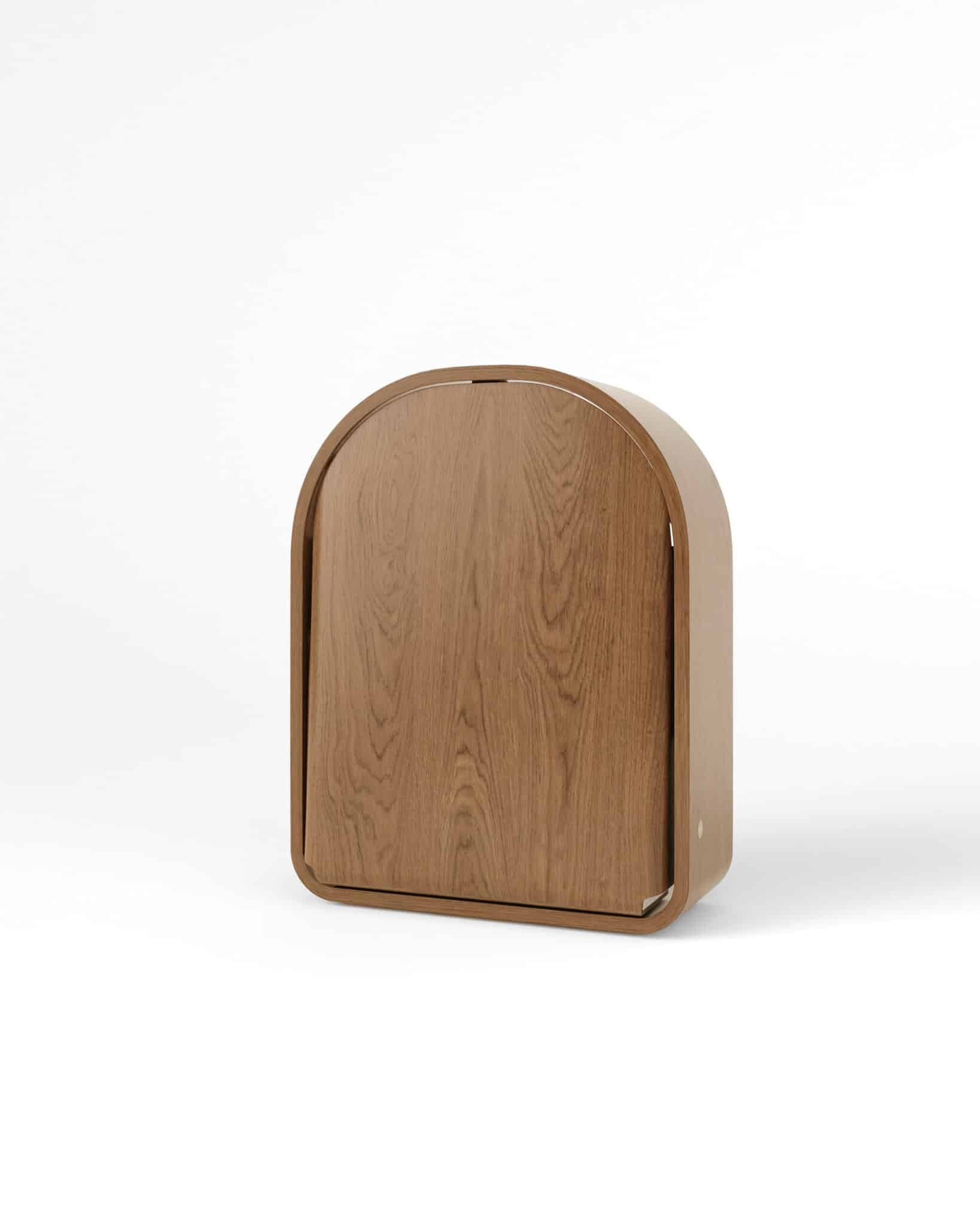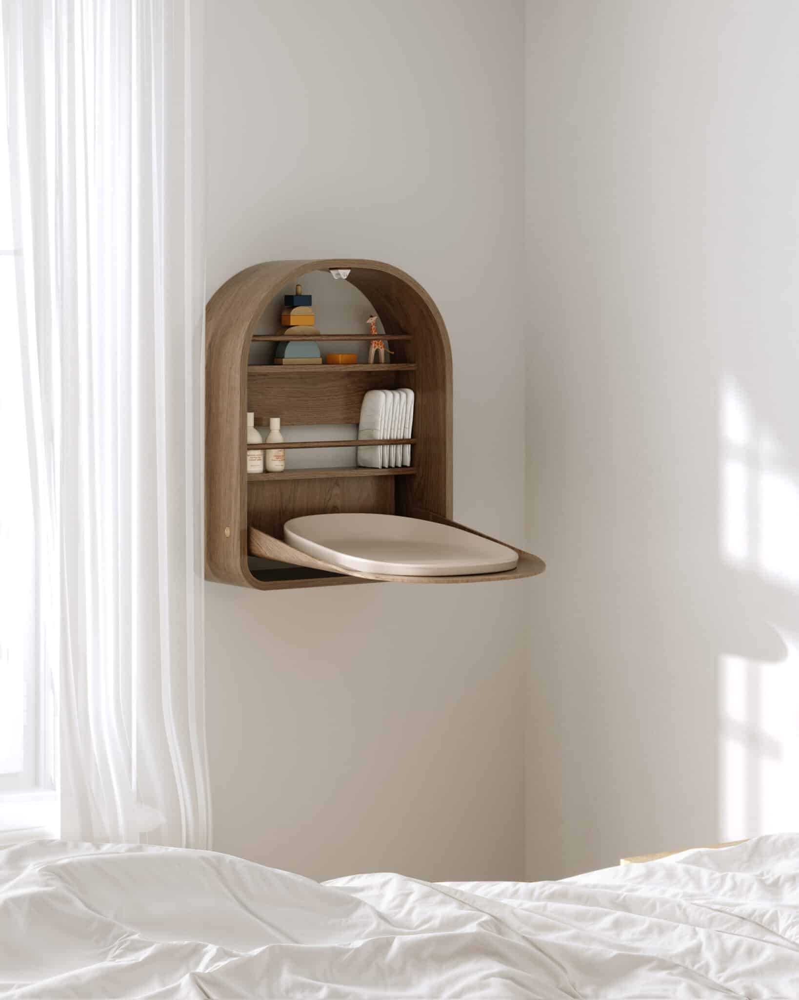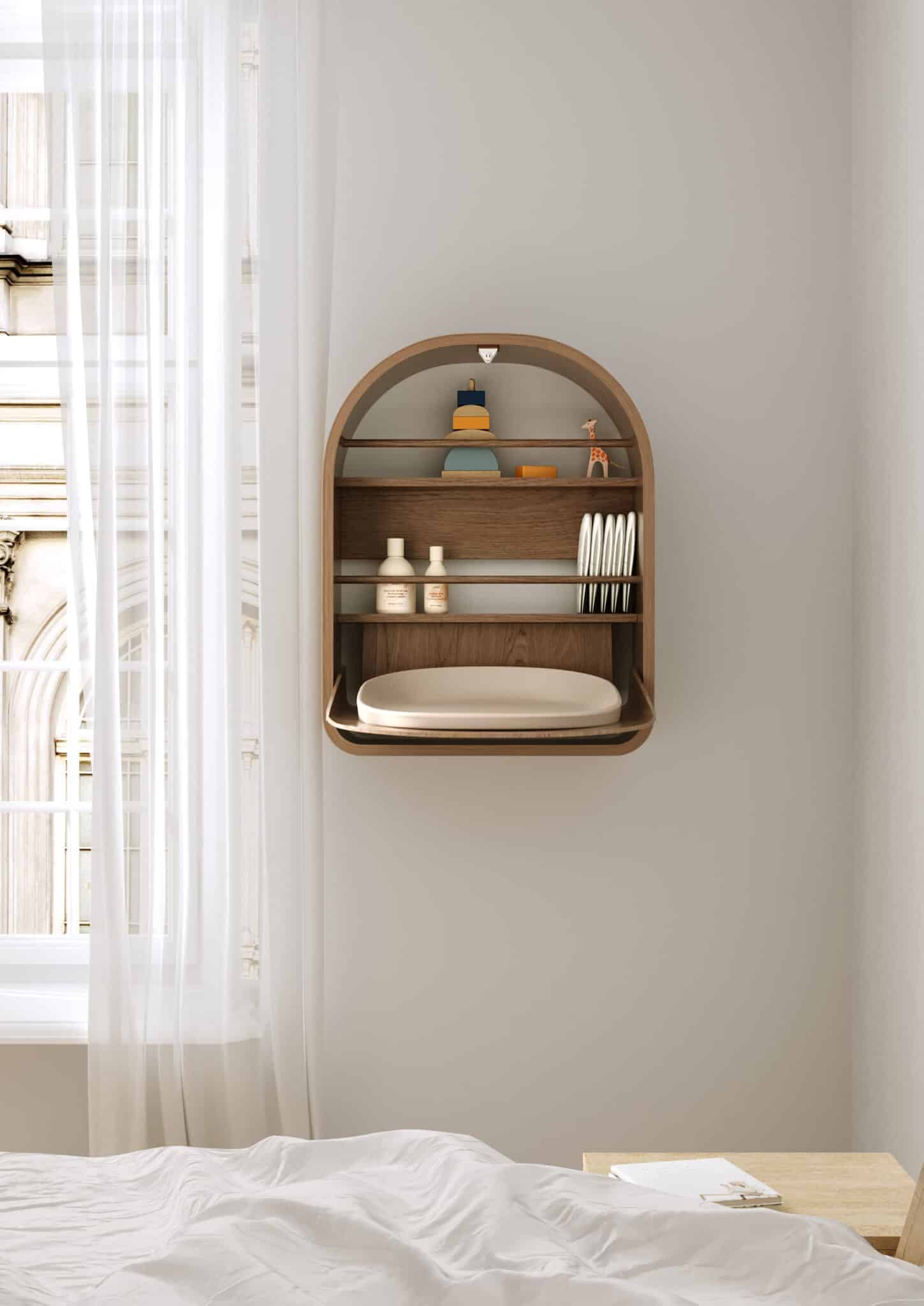 Kai væghængt puslebord kombinerer æstetik og funktionalitet med sine runde, smukke former. Det er perfekt til mindre boliger og pladsbesparende værelser, hvor det både sparer plads og tilføjer et stilfuldt touch. Puslebordet åbnes og lukkes nemt med det Easy Touch-system, hvilket gør det både praktisk og brugervenligt.