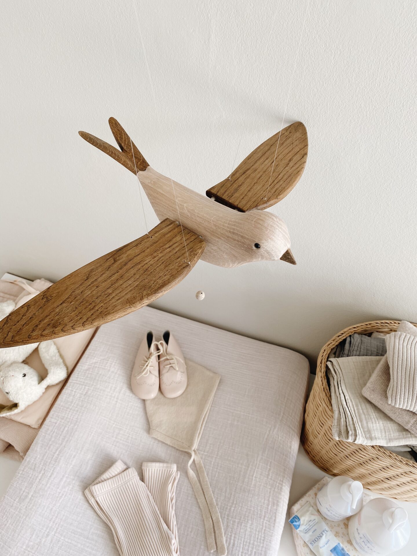 Denne klassiske smukke fugl, der i al sin enkelhed kan hænge på børneværelset i mange år frem. Når du hiver i snoren basker Koko elegant sine vinger.