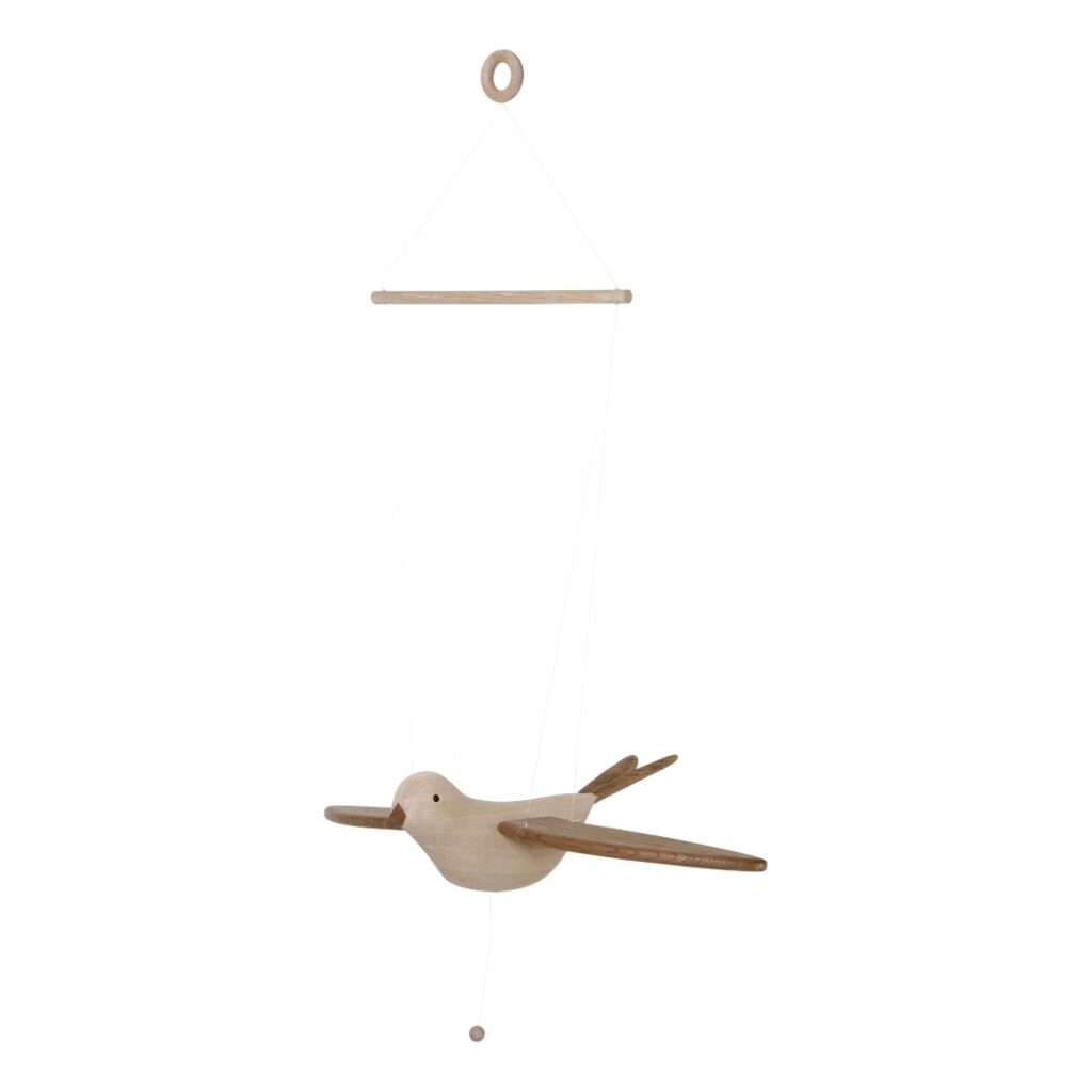 Denne klassiske smukke fugl, der i al sin enkelhed kan hænge på børneværelset i mange år frem. Når du hiver i snoren basker Koko elegant sine vinger.